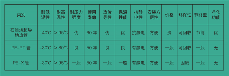 從以上數據對比可以看出,石墨烯超導地暖管與傳統PE-RT/PE-X地暖管相比,性能有顯著的提升。在節能方面表現突出,使用石墨烯超導地暖管可比傳統地暖管節能30%以上。并且具有自潔功能,可以有效凈化水中的霉菌顆粒等,從而提高管道及整個系統的使用壽命。